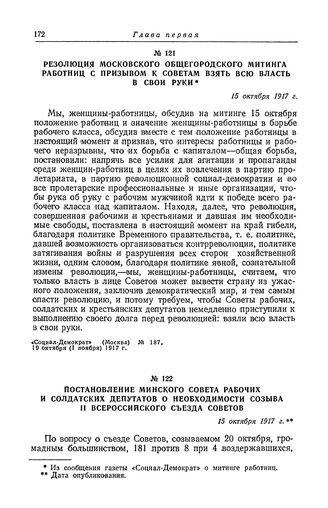 Резолюция московского общегородского митинга работниц с призывом к Советам взять всю власть в свои руки. 15 октября 1917 г. // «Социал-Демократ» (Москва) № 187, 19 октября (1 ноября) 1917 г.