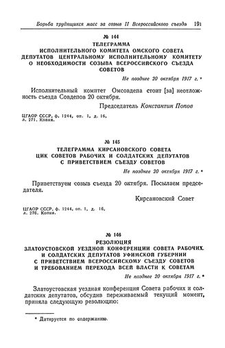 Телеграмма Кирсановского Совета ЦИК Советов рабочих и солдатских депутатов с приветствием съезду Советов. Не позднее 20 октября 1917 г. // ЦГАОР СССР, ф. 1244, оп. 1, д. 16, л. 276. Копия.