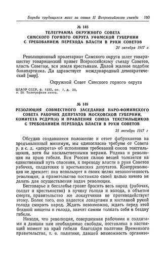 Резолюция совместного заседания Наро-Фоминского Совета рабочих депутатов Московской губернии, комитета РСДРП(б) и правления союза текстильщиков с требованием перехода власти в руки Советов. 21 октября 1917 г.