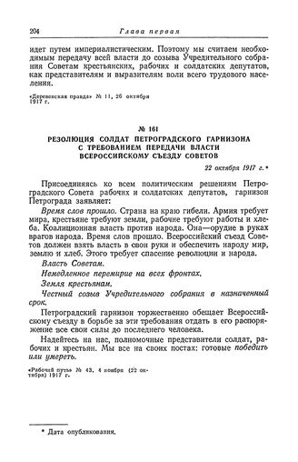 Резолюция солдат Петроградского гарнизона с требованием передачи власти Всероссийскому съезду Советов. 22 октября 1917 г. // «Рабочий путь» № 43, 4 ноября (22 октября) 1917 г.
