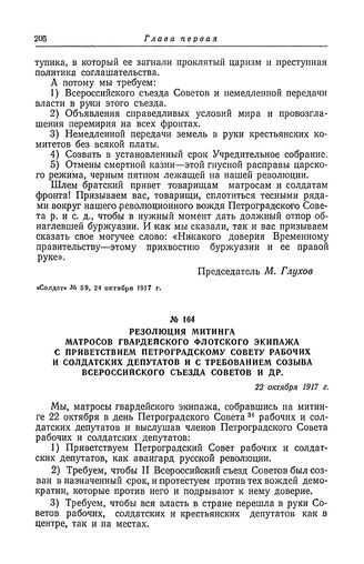Резолюция митинга матросов гвардейского флотского экипажа с приветствием Петроградскому Совету рабочих и солдатских депутатов и с требованием созыва Всероссийского съезда Советов и др. 22 октября 1917 г. // «Солдат» № 60, 25 октября 1917 г.