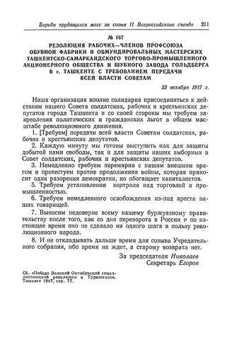 Резолюция рабочих — членов профсоюза обувной фабрики и обмундировальных мастерских Ташкентско-Самаркандского торгово-промышленного акционерного общества и Шубного завода Гольдберга в г. Ташкенте с требованием передачи всей власти Советам. 23 октяб...