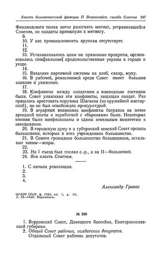 Анкета большевистской фракции II Всероссийского съезда Советов рабочих и солдатских депутатов. Верровский Совет, Донецкого бассейна, Екатеринославской губернии // ЦГАОР СССР, ф. 1235, оп. 1, д. 9, л. 47—48 об. Подлинник.