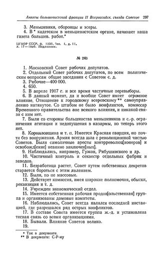 Анкета большевистской фракции II Всероссийского съезда Советов рабочих и солдатских депутатов. Московский Совет рабочих депутатов // ЦГАОР СССР, ф. 1235, оп. 1, д. 10, л. 43—44 об. Подлинник.