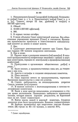 Анкета большевистской фракции II Всероссийского съезда Советов рабочих и солдатских депутатов. Николаевского [уезда] Самарск[ой] [губернии], Петровского уез[да] Совет р. с. к. д. Новоузенского уез[да] Совет р. с. и к. [д.], Тоцкого лагеря 52 тыс. р[абочих] и сол[дат] и 500 000 кр[естьян] // ЦГАОР СССР, ф. 1235, оп. 1, д. 11, л. 21—22 об. Подлинник.