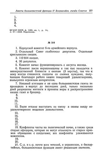 Анкета большевистской фракции II Всероссийского съезда Советов рабочих и солдатских депутатов. Корпусной комитет 6-го армейского корпуса // ЦГАОР СССР, ф. 1235, оп. 1, д. 14, л. 19—20 об. Подлинник.