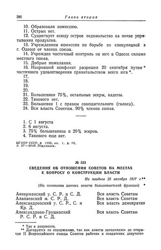 Сведения об отношении Советов на местах к вопросу о конструкции власти. Не позднее 25 октября 1917 г. // «Второй Всероссийский съезд Советов, Р. и С. Д.» М.-Л. 1928, стр. 144—153.