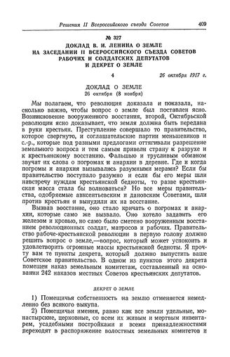 Доклад В. И. Ленина о земле на заседании II Всероссийского съезда Советов рабочих и солдатских депутатов и декрет о земле. 26 октября 1917 г. // В. И. Ленин, Соч., т. 26, стр. 225—229.