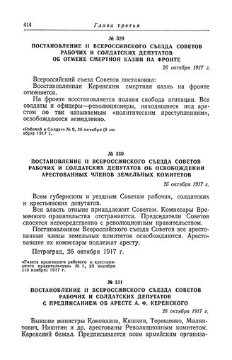 Постановление II Всероссийского съезда Советов рабочих и солдатских депутатов об отмене смертной казни на фронте. 26 октября 1917 г. // «Рабочий и Солдат» № 9, 26 октября (8 ноября) 1917 г.