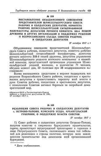 Постановление объединенного совещания представителей Шлиссельбургского Совета рабочих и солдатских депутатов, комитета рабочих Шлиссельбургской ситценабивной мануфактуры, делегатов ротного комитета 308-й пешей дружины и других организаций о поддержке решений II Всероссийского съезда Советов рабочих и солдатских депутатов. 27 октября 1917 г. // «Известия ЦИК и Петроградского Совета рабочих и солдатских депутатов» № 208, 27 октября 1917 г.