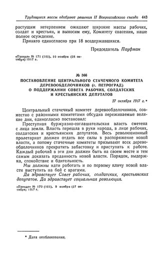 Постановление Центрального стачечного комитета деревообделочников (г. Петроград) о поддержании Совета рабочих, солдатских и крестьянских депутатов. 27 октября 1917 г. // «Правда» № 170 (101), 9 ноября (27 октября) 1917 г.