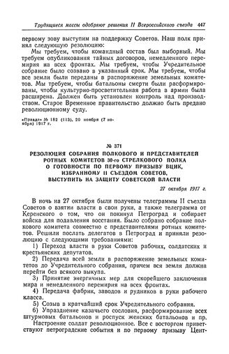 Резолюция собрания полкового и представителей ротных комитетов 30-го стрелкового полка о готовности по первому призыву ВЦИК, избранному II съездом Советов, выступить на защиту Советской власти. 27 октября 1917 г. // «Правда» № 182 (113), 20 ноября (7 ноября) 1917 г.