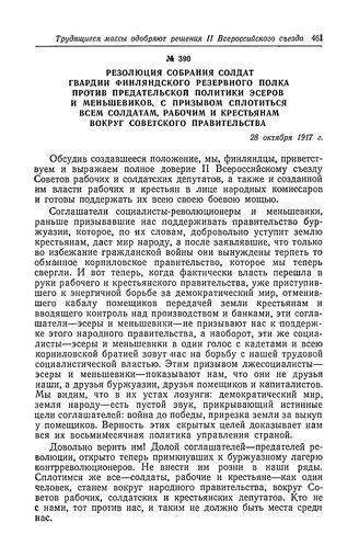 Резолюция собрания солдат гвардии Финляндского резервного полка против предательской политики эсеров и меньшевиков, с призывом сплотиться всем солдатам, рабочим и крестьянам вокруг Советского правительства. 28 октября 1917 г. // «Правда» № 174 (105), 13 ноября (31 октября) 1917 г.