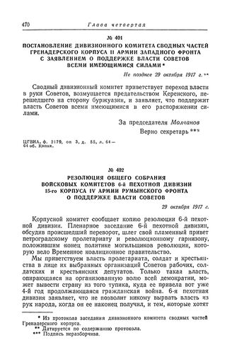 Постановление дивизионного комитета сводных частей гренадерского корпуса II армии Западного фронта с заявлением о поддержке власти Советов всеми имеющимися силами. Не позднее 29 октября 1917 г.