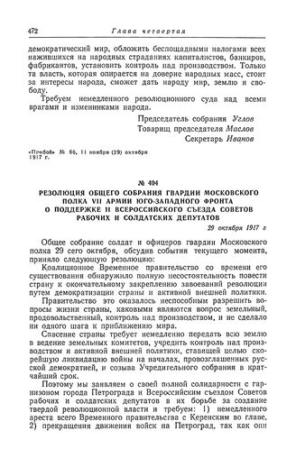 Резолюция общего собрания гвардии Московского полка VII армии Юго-Западного фронта о поддержке II Всероссийского съезда Советов рабочих и солдатских депутатов. 29 октября 1917 г. // ЦГВИА, ф. 2178, оп. 2, д. 31, л. 471. Заверенная копия.