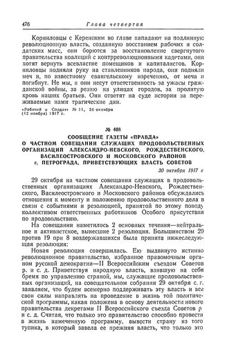 Сообщение газеты «Правда» о частном совещании служащих продовольственных организаций Александро-Невского, Рождественского, Василеостровского и Московского районов г. Петрограда, приветствующих власть Советов. 30 октября 1917 г.