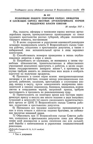 Резолюция общего собрания солдат, офицеров и служащих сорока местных артиллерийских парков о поддержке власти Советов. 30 октября 1917 г.