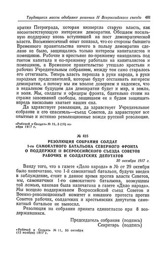 Главная Второй Всероссийский съезд Советов рабочих и солдатских депутатов Документы Резолюция собрания солдат 1-го Самокатного батальона Северного фрон...
