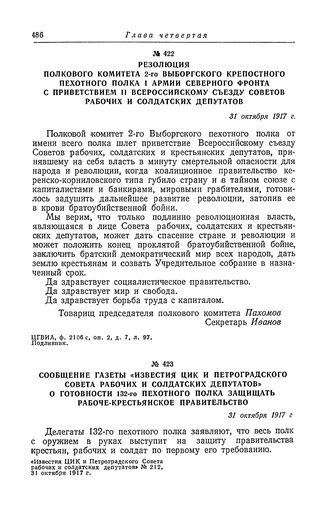 Резолюция полкового комитета 2-го Выборгского крепостного пехотного полка I армии Северного фронта с приветствием II Всероссийскому съезду Советов рабочих и солдатских депутатов. 31 октября 1917 г.