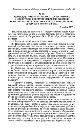 Резолюция Мотовилихинского Совета рабочих и солдатских депутатов Пермской губернии о взятии власти в свои руки и поддержке декретов Советского правительства. 1 ноября 1917 г. // «Пролетарское знамя» № 6, 7 ноября 1917 г.