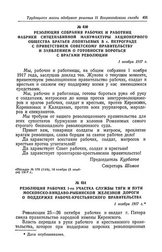 Резолюция собрания рабочих и работниц фабрики ситценабивной мануфактуры акционерного общества братьев Леонтьевых в г. Петрограде с приветствием Советскому правительству и заявлением о готовности бороться с врагами революции. 1 ноября 1917 г. // «Правда» № 178 (109), 16 ноября (3 ноября) 1917 г.