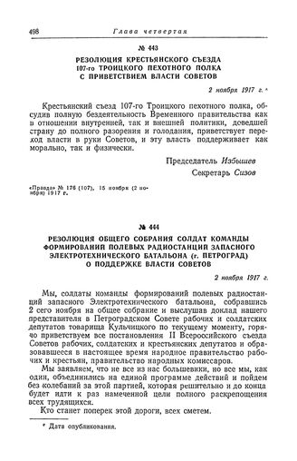 Резолюция крестьянского съезда 107-го Троицкого пехотного полка с приветствием власти Советов. 2 ноября 1917 г. // «Правда» № 176 (107), 15 ноября (2 ноября) 1917 г.