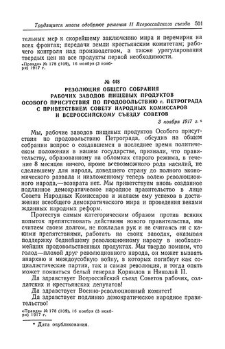 Резолюция общего собрания рабочих заводов пищевых продуктов Особого присутствия по продовольствию г. Петрограда с приветствием Совету Народных Комиссаров и Всероссийскому съезду Советов. 3 ноября 1917 г. // «Правда» № 178 (109), 16 ноября (3 ноября) 1917 г.