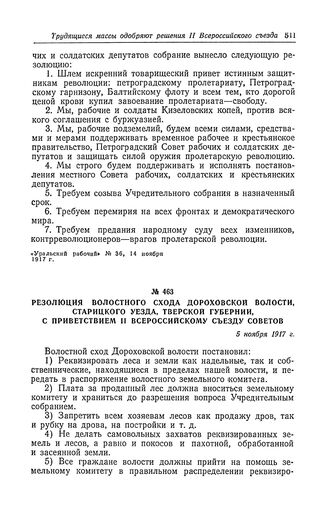 Резолюция волостного схода Дороховской волости, Старицкого уезда, Тверской губернии, с приветствием II Всероссийскому съезду Советов. 5 ноября 1917 г.