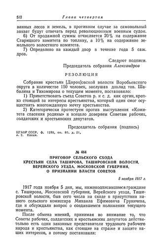 Приговор сельского схода крестьян села Таширова, Ташировской волости, Верейского уезда, Московской губернии, о признании власти Советов. 5 ноября 1917 г.