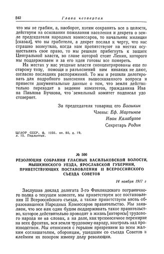 Резолюция собрания гласных Васильковской волости, Мышкинского уезда, Ярославской губернии, приветствующих постановления II Всероссийского съезда Советов. 14 ноября 1917 г. // ЦГАОР СССР, ф. 1235, оп. 80, д. 23, л. 1—2. Подлинник.