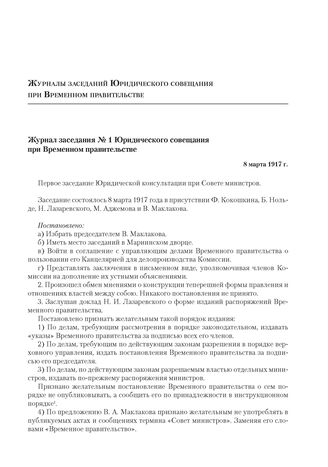 Органы государственного управления -- Временное правительство -- Юридическое совещание при Временном правительстве -- Журналы заседаний