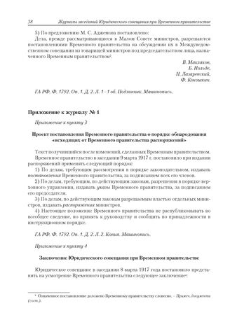Приложение к журналу № 1. Приложение к пункту 4. Заключение Юридического совещания при Временном правительстве