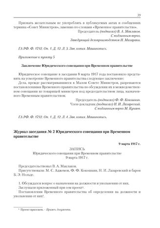 Журнал заседания № 2 Юридического совещания при Временном правительстве. 9 марта 1917 г.
