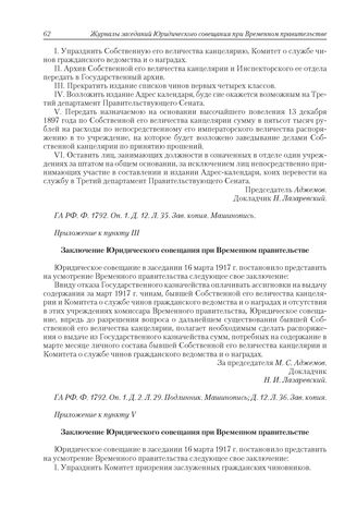 Приложение к журналу № 7. Приложение к пункту III. Заключение Юридического совещания при Временном правительстве // ГА РФ. Ф. 1792. Оп. 1. Д. 2. Л. 29. Подлинник. Машинопись; Д. 12. Л. 36. Зав. копия.