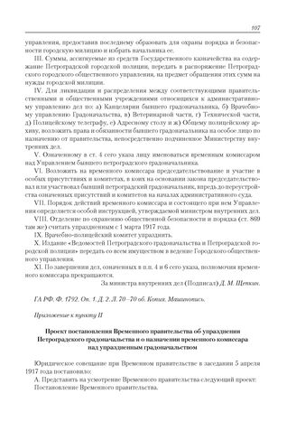 Приложение к журналу № 18. Приложение к пункту II. Проект постановления Временного правительства об упразднении Петроградского градоначальства и о назначении временного комиссара над упраздненным градоначальством // ГА РФ. Ф. 1792. Оп. 1. Д. 2. Л. 71–71 об. Копия. Машинопись; Д. 12. Л. 55–55 об. Зав. копия. Машинопись.