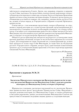Приложение к журналам № 20, № 21. Заключение Юридического совещания при Временном правительстве по проекту предложения Правительства Финляндскому Сейму о передаче решения некоторых дел Финляндскому Сенату и генерал-губернатору