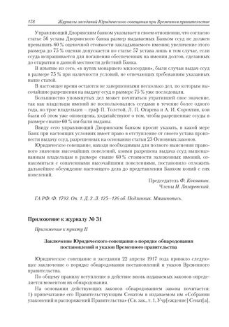 Приложение к журналу № 31. Приложение к пункту II. Заключение Юридического совещания о порядке обнародования постановлений и указов Временного правительства // ГА РФ. Ф. 1792. Оп. 1. Д. 2. Л. 127–128. Копия. Машинопись; Д. 12. Л. 91–92. Зав. копия. Машинопись.
