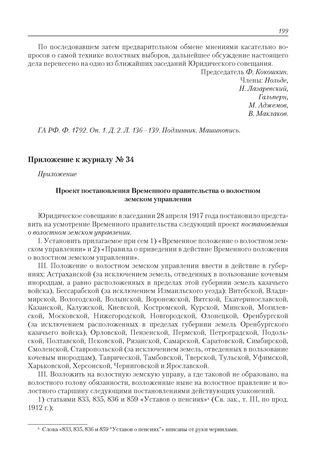 Приложение к журналу № 34. Проект постановления Временного правительства о волостном земском управлении