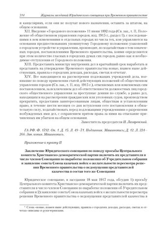 Приложение к журналу № 47. Приложение к пункту II. Заключение Юридического совещания по поводу просьбы Центрального комитета Христианско-демократической партии включить их представителя в число членов Совещания по выработке положения об Учредительном собрании и заявление совета Союза казачьих войск о желательности пересмотра решения Временного правительства о недопущении представителей казачества в состав того же Совещания // ГА РФ. Ф. 1792. Оп. 1. Д. 15. Л. 25. Подлинник. Машинопись; Д. 12. Л. 216. Зав. копия. Машинопись.