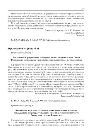 Приложение к журналу № 48. Приложение к пункту I. Заключение Юридического совещания с замечаниями на проект доклада статс-секретаря Финляндии о порядке расходования части бюджетных средств Финляндии // ГА РФ. Ф. 1792. Оп. 1. Д. 15. Л. 26. Подлинник. Машинопись; Л. 34. Копия. Типограф. экз.; Д. 12. Л. 220. Зав. копия. Типограф. экз.