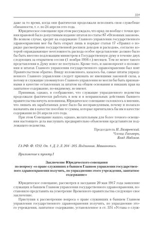 Приложение к журналу № 49. Приложение к пункту I. Заключение Юридического совещания по вопросу «о праве служивших в бывшем Главном управлении государственного здравоохранения получить, по упразднению этого учреждения, заштатное содержание» // ГА РФ. Ф. 1792. Оп. 1. Д. 2. Л. 41–42, 45. Подлинник. Машинопись; Д. 15. Л. 41–42, 45. Подлинник. Машинопись; Д. 12. Л. 315–317. Зав. копия. Машинопись.