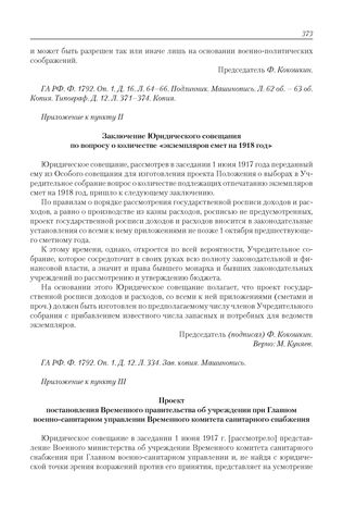 Приложение к журналу № 55. Приложение к пункту II. Заключение Юридического совещания по вопросу о количестве «экземпляров смет на 1918 год» // ГА РФ. Ф. 1792. Оп. 1. Д. 12. Л. 334. Зав. копия. Машинопись.