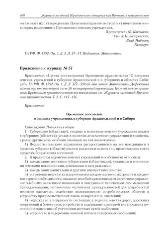 Приложение к журналу № 57. Временное положение о земских учреждениях в губернии Архангельской и в Сибири // ГА РФ. Ф. 1792. Оп. 1. Д. 12. Л. 399–428 об. Зав. копия. Машинопись.
