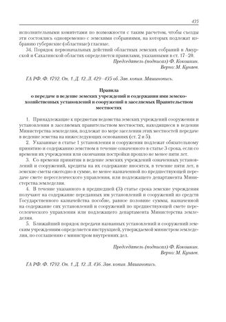 Приложение к журналу № 57. Правила о передаче в ведение земских учреждений и содержании ими земско-хозяйственных установлений и сооружений в заселяемых Правительством местностях // ГА РФ. Ф. 1792. Оп. 1. Д. 12. Л. 436. Зав. копия. Машинопись.