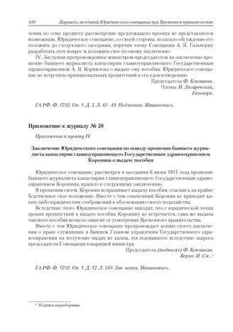 Приложение к журналу № 58. Приложение к пункту IV. Заключение Юридического совещания по поводу прошения бывшего журналиста канцелярии главноуправляющего Государственным здравоохранением Коронина о выдаче пособия // ГА РФ. Ф. 1792. Оп. 1. Д. 12. Л. 349. Зав. копия. Машинопись.
