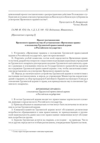 Приложения к журналу № 74. Приложение к пункту I. Проект постановления Временного правительства об установлении «Временных правил о положении Грузинской православной церкви в Российском государстве» // ГА РФ. Ф. 1792. Оп. 1. Д. 17. Л. 206–207. Зав. копия. Машинопись; Д. 18. Л. 15 об. – 16. Зав. копия. Машинопись с редакционной правкой.