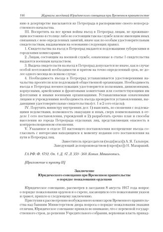 Приложения к журналу № 85. Приложение к пункту II. Заключение Юридического совещания при Временном правительстве о порядке пожалования орденами