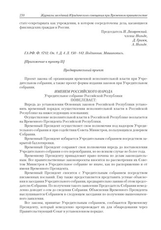 Приложение к журналу № 100 Приложение к пункту II. Предварительный проект. Проект закона об организации временной исполнительной власти при Учредительном собрании, а также проект формы издания законов при Учредительном собрании