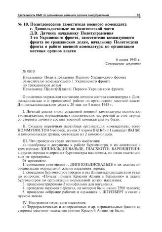 Политдонесение заместителя военного коменданта г. Диппольдисвальде по политической части Д.В. Дятчина начальнику Политуправления 1-го Украинского фpoнтa, заместителю командующего фронта по гражданским делам, начальнику Политотдела фронта о работе военной комендатуры по организации местных органов власти. 6 июня 1945 г. // ГА РФ. Ф. P-7399. Оп. 1. Д. 3. Л. 390-391. Подлинник.