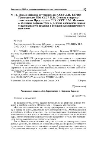 Письмо наркома внутренних дел СССР Л.П. Берии Председателю ГКО СССР И.В. Сталину и первому заместителю Председателя СНК СССР B.M. Молотову о получении бургомистром г. Берлина анонимного письма о недопустимости введения в Германии коммунистического правления. 9 июня 1945 г. // ГА РФ. Ф. P-9401. Оп. 2. Д. 96. Л. 300-304. Заверенная копия.